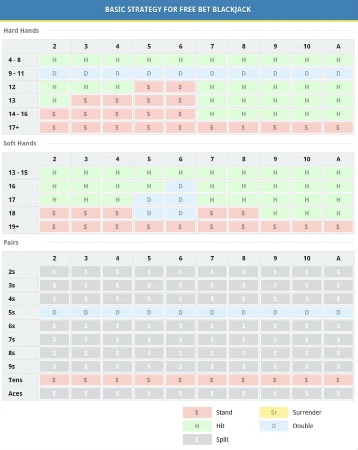 We offer you the scheme of Free Bet Blackjack strategy, which clearly demonstrates the actions of the player with each hand.
